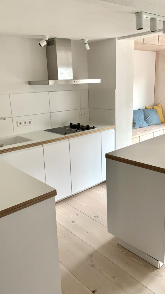 Die neue Küche erhielt Arbeitsplatten aus beschichteten Multiplexplatten, präzise gefertigt und abgestimmt auf das ruhige Materialbild.