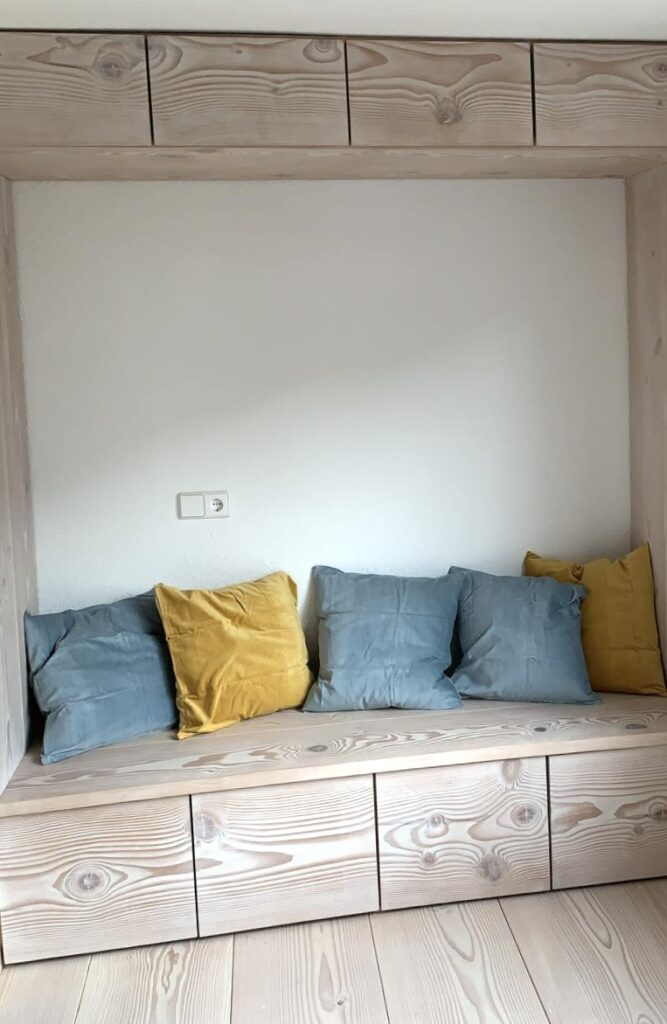 Maßgefertigte Sitzbank aus geweißter Douglasie mit integrierten Schubladen für zusätzlichen Stauraum.