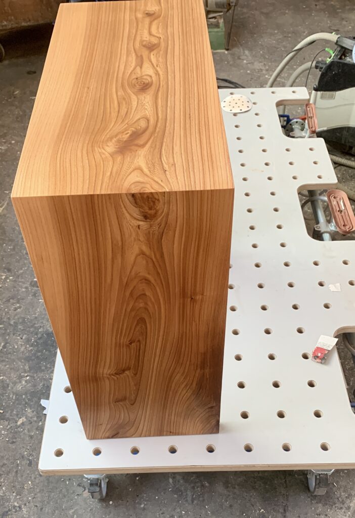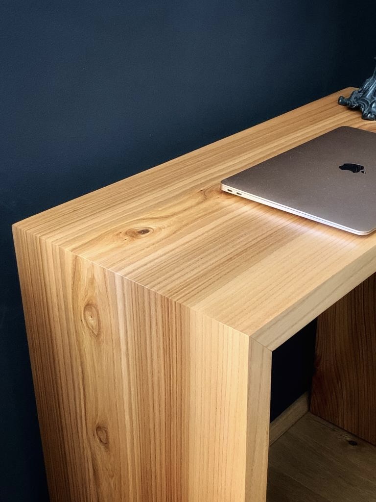 Schlicht, klar und zeitlos: Dieser maßgefertigte Schreib- und Konsolentisch wurde aus massiver Ulme gefertigt und verbindet ruhige Linien mit natürlicher Präsenz. Die durchgehende Maserung betont den Charakter des Materials und lässt das Möbelstück wie aus einem Stück gewachsen wirken.